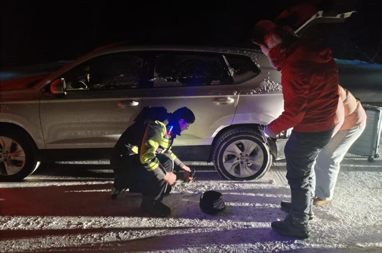 寒夜車輪爆胎 呼瑪交警“警”急救援 暖心服務顯擔當
