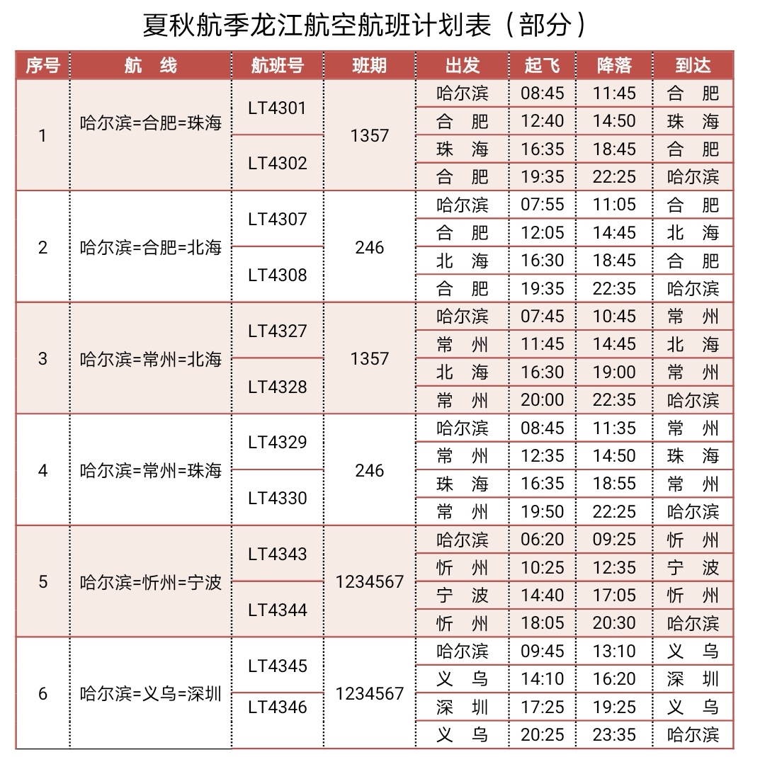 哈爾濱—合肥—珠海航線航班號為LT4301/2,每周一、三、五、日執(zhí)行4班;哈爾濱—合肥—北海航線航班號為LT4307/8,每周二、四、六執(zhí)行3班;哈爾濱—常州—北海航線航班號為LT4327/8,每周一、三、五、日執(zhí)行4班;哈爾濱—常州—珠海航線航班號為LT4329/30,每周二、四、六執(zhí)行3班;哈爾濱—忻州—寧波航線航班號為LT4343/4,每天一班;哈爾濱—義烏—深圳航線航班號為LT4345/6,每天一班。