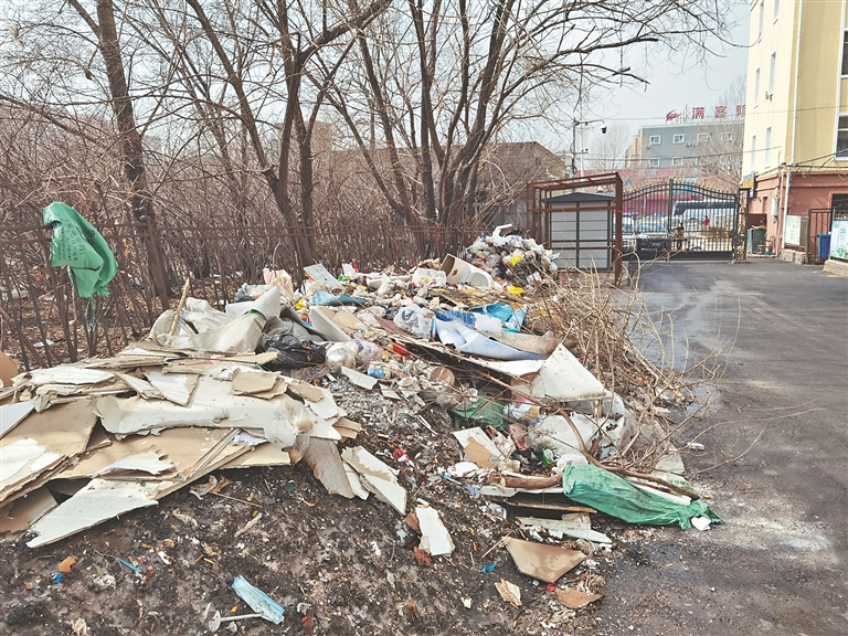 南崗區(qū)學府路300號至308號之間,是一片改造后的老舊小區(qū),一側(cè)大門還有戴紅袖標的人員看守。進入后,道路一側(cè)出現(xiàn)了垃圾帶,生活垃圾、裝修垃圾、放棄雜物和殘冰殘雪,堆出了20米的“長龍”。據(jù)這里的居民介紹,小區(qū)沒有物業(yè),衛(wèi)生由街道管理?!坝捎陂L期不外運,天熱的時候,這里的垃圾會很臭。其實小區(qū)環(huán)境還不錯,就是缺少管理?!?/span>