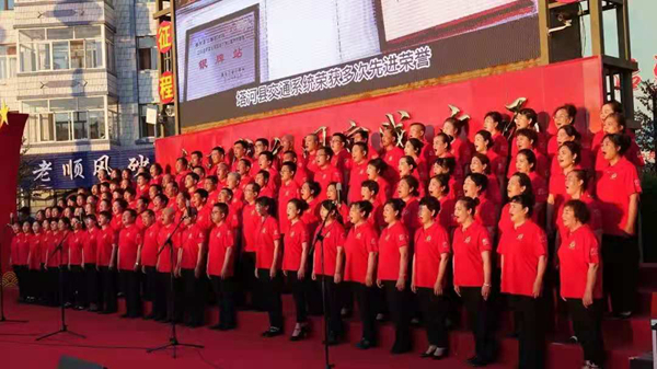 在歌聲中重溫百年歷程,追尋紅色記憶;在歌聲中砥礪無悔初心,汲取奮進力量。塔河縣廣大職工群眾在縣新時代文明實踐廣場以大合唱的方式縱情高歌,用滿腔的熱忱唱出了對黨的熱愛,對偉大祖國的贊美。由塔河縣森林之聲合唱團表演的曲目《祖國頌》《我愛你中國》拉開了演出的序幕,瞬間就調(diào)動了人們的情緒,激發(fā)了人們的愛國豪情?!恫煌跣摹贰蹲呦驈?fù)興》《強軍戰(zhàn)歌》《忠誠于黨》等一首首經(jīng)典曲目表達了塔河兒女對黨的忠誠與熱愛,展現(xiàn)了塔河人奮發(fā)有為、積極向上的良好精神風(fēng)貌。