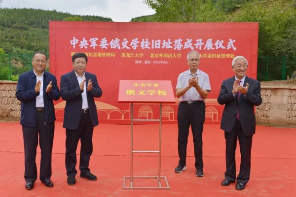 延安革命紀(jì)念地管理局黨委書記薛耀軍、黑龍江大學(xué)黨委書記王永清、北京外國語大學(xué)校友總會(huì)會(huì)長楊學(xué)義工、中央軍委俄文學(xué)校校長曾涌泉之子曾建為中央軍委俄文學(xué)校舊址展覽揭牌。