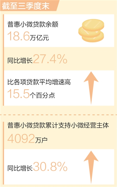 中國人民銀行發(fā)布的最新數(shù)據(jù)顯示,截至三季度末,我國普惠小微貸款余額18.6萬億元,同比增長27.4%,比各項貸款平均增速高15.5個百分點。普惠小微貸款維持較高的增長態(tài)勢,繼續(xù)保持量增、面擴、價降、結構優(yōu)化的特點。