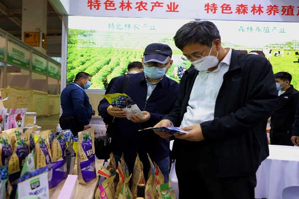 阿木爾林業(yè)局黨委書記胡守慶(右一)查看參展產(chǎn)品質(zhì)量情況(王力/攝)