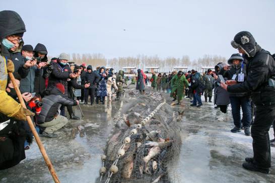 另外,杜爾伯特連環(huán)湖水產(chǎn)資源豐富,水產(chǎn)養(yǎng)殖業(yè)水域面積56萬多畝,湖內(nèi)盛產(chǎn)40種淡水魚類,尤以鯉魚、草魚、鰱魚、胖頭魚、鯽魚、黑魚等為多,年捕魚千余噸,冬網(wǎng)捕魚更是傳統(tǒng)習俗。連環(huán)湖溫泉景區(qū)冬季每天上午免費開展民俗冬捕活動,購魚享受8折優(yōu)惠,還可以參與抽獎活動。