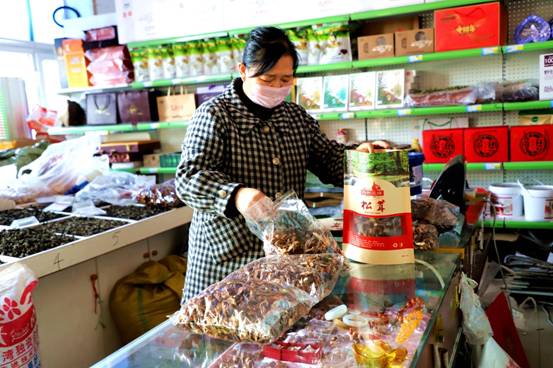 藍(lán)領(lǐng)山特產(chǎn)品店經(jīng)營(yíng)業(yè)主高桂杰正在為客戶備貨。