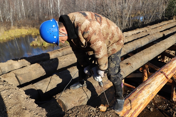 阿木爾林業(yè)局多種經(jīng)營公司職工李訓(xùn)武在修復(fù)水毀橋梁(王力 攝)
