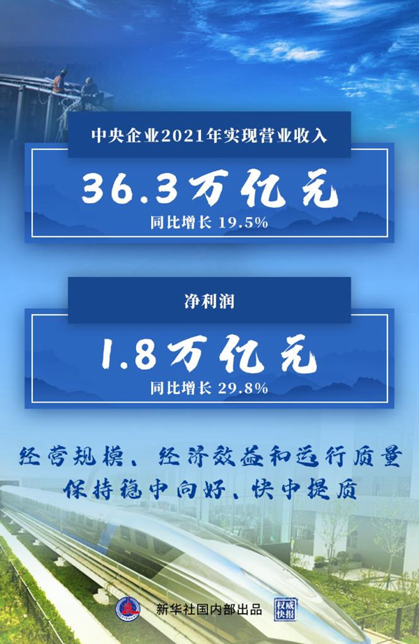 2021年,中央企業(yè)完成固定資產投資(不含房地產)3.2萬億元,同比增長10.1%;上繳稅費2.4萬億元,同比增長20%;截至去年末中央企業(yè)資產負債率保持在64.9%,圓滿完成預期目標。