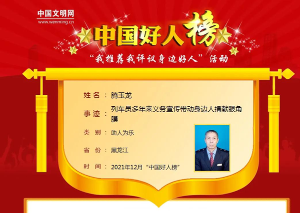 騰玉龍,鐵力市人,曾先后榮獲“龍江好人”“伊春好人”“最美鐵力人”等榮譽稱號。他曾多次捐贈造血干細胞,挽救了3個人的生命。在他的帶動下,他的家庭成為中國首個眼角膜、身體器官和造血干細胞捐獻志愿者家庭。騰玉龍同志入選2021年12月“中國好人榜”后,鐵力市精心組織策劃,動員廣大干部群眾為典型點贊助力,組織全市各單位、各社區(qū)居民學習“中國好人”先進事跡。