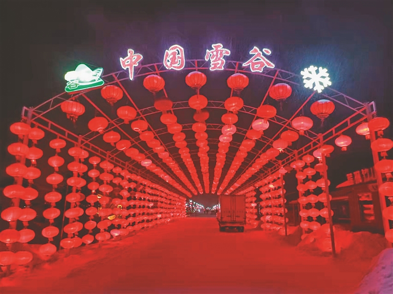 當(dāng)我們抵達(dá)雪谷的時候,暮色已濃,天地間覆蓋了一片黑色的幕布。但雪谷中心街道上,聳立著由上千只大紅燈籠排列組合的拱形門,燈火輝煌,延續(xù)百米開外。門的頂端中央鑲嵌著“中國雪谷”四個金色大字,格外醒目。我們停下車拍照,并就近住宿,溫暖的火炕讓我們很快進(jìn)入夢鄉(xiāng)。