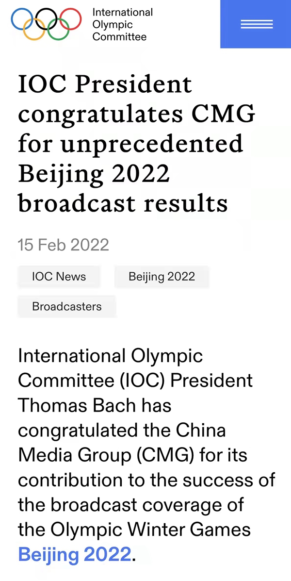 據(jù)國際奧委會官方網(wǎng)站2月15日消息:國際奧委會主席托馬斯·巴赫對中央廣播電視總臺為成功轉(zhuǎn)播報道2022年北京冬奧會所做出的貢獻(xiàn)表示祝賀。