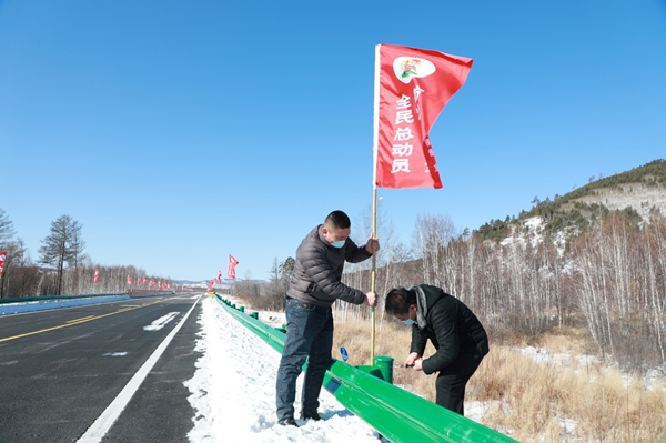 長(zhǎng)山林場(chǎng)干部職工在G111國(guó)道安裝防火彩旗。(王力 攝)