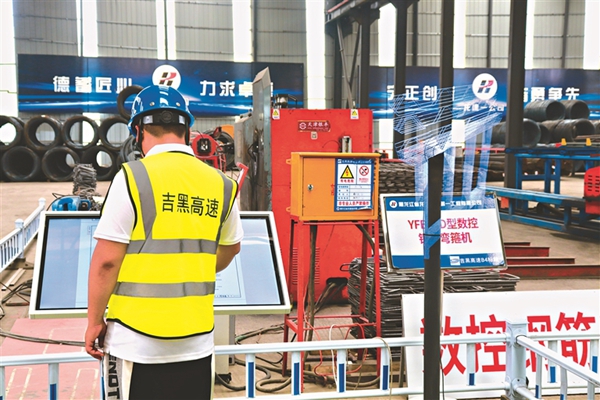 鋼筋加工車(chē)間里一處3D立體投影,讓工人們可以直觀看到自己加工后的構(gòu)件將用于整體鋼筋骨架的哪個(gè)部位。任書(shū)法說(shuō),吉黑高速項(xiàng)目打造智慧梁廠,采用了數(shù)控鋼筋滾焊機(jī)、數(shù)控鋼筋剪切生產(chǎn)線(xiàn)、數(shù)控鋼筋彎曲中心+自動(dòng)上料配套等設(shè)備,以前這么大的加工廠要30多人,現(xiàn)在只需一半的人力,就能干出兩倍的工作量,極大提高了施工精度和效率。