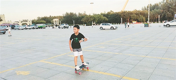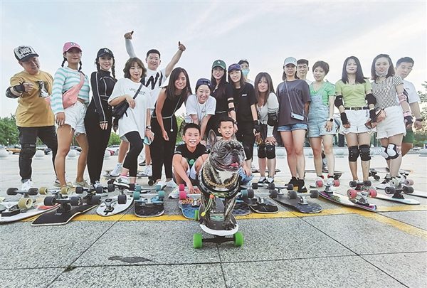 7月21日18時(shí)許,太陽(yáng)島地鐵站出口附近的小廣場(chǎng),一群人抱著陸沖板陸續(xù)趕到,其中“80后”“90后”居多,還有帶孩子來(lái)的“寶媽”。不少人來(lái)的時(shí)候穿著上班的職業(yè)裝,換上圓領(lǐng)T恤,戴上鴨舌帽,配齊護(hù)具,簡(jiǎn)單熱身后,迫不及待地開(kāi)滑。