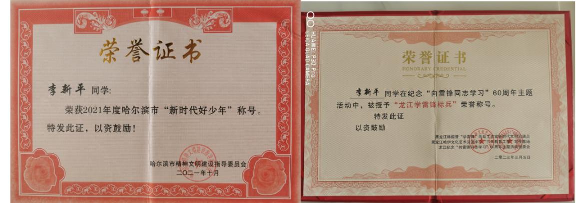 李新平同學(xué)就讀于呼蘭區(qū)建國(guó)小學(xué)五年五班,他勤奮好學(xué)、品學(xué)兼優(yōu)、樂(lè)觀向上、自強(qiáng)自立。從一年級(jí)開始就擔(dān)任班長(zhǎng)職務(wù),先后多次被評(píng)為三好學(xué)生、優(yōu)秀學(xué)生干部、優(yōu)秀少先隊(duì)員,榮獲2021年度哈爾濱市“新時(shí)代好少年”稱號(hào)、榮獲2021年第三屆龍江好少年活動(dòng)“龍江愛心大使”和“城市形象大使”,2022年被黑龍江省積善之家?guī)头鲋行那嗌倌曛驹刚呖傟?duì)授予“公益達(dá)人”稱號(hào),2023年在紀(jì)念“向雷鋒同志學(xué)習(xí)”60周年主題活動(dòng)中被韓振清學(xué)雷鋒創(chuàng)新工作室授予“龍江學(xué)雷鋒標(biāo)兵”榮譽(yù)稱號(hào)。在多類體育運(yùn)動(dòng)競(jìng)賽活動(dòng)中獲得等級(jí)證書及榮譽(yù)稱號(hào),出色的表現(xiàn)和真誠(chéng)的付出,贏得了大家的信任、同學(xué)們的信賴、家長(zhǎng)們的喜愛。