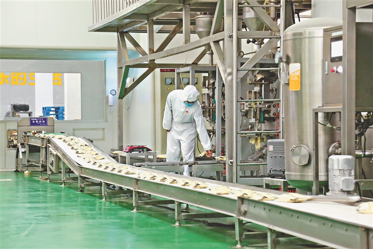 農(nóng)墾龍王食品公司車間的生產(chǎn)線正開足馬力運轉。本報記者 張翎攝