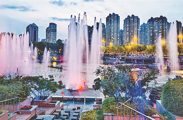 夏日夜晚,哈爾濱市群力金河公園音樂(lè)谷內(nèi),伴隨著悠揚(yáng)的樂(lè)曲,大型噴泉“翩翩起舞”,與霓虹彩燈交相輝映,構(gòu)成一幅美麗的畫面。