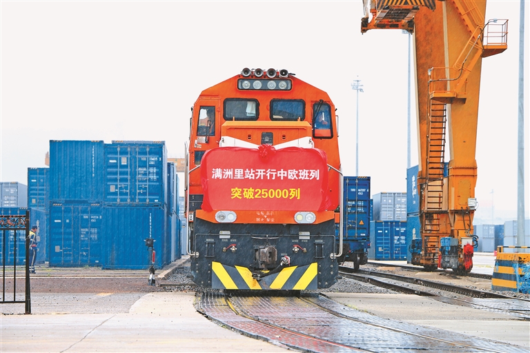 滿洲里鐵路口岸通行中歐班列突破25000列。黃旭攝