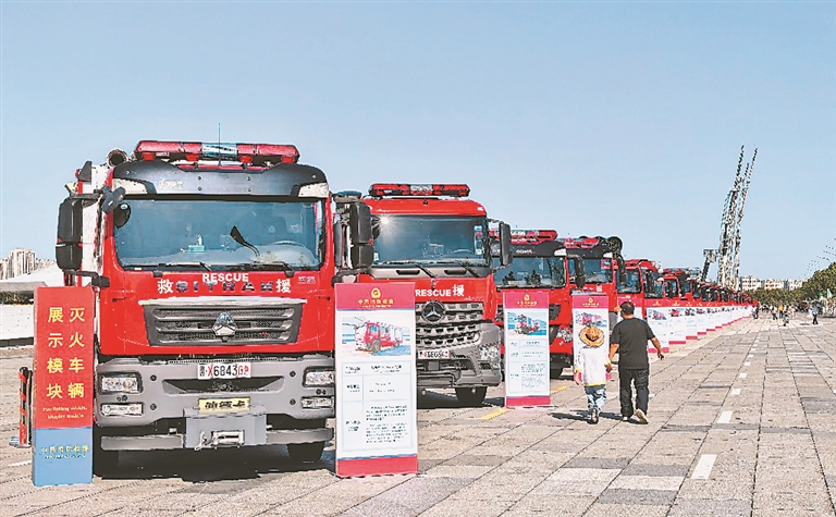 此次裝備觀摩活動主題為“促進消防裝備技術(shù)交流,提升滅火救援專業(yè)能力”。觀摩區(qū)面積約20000平方米,分為消防車輛區(qū)和消防裝備區(qū)兩個部分,共計陳列消防車35種、36輛,器材119 種、200 余件套。其中,消防車輛觀摩區(qū)劃分為滅火類消防車、專勤類消防車、后援類消防車、通信類消防車和舉高類消防車五個部分,主要由水罐消防車、遠程供水系統(tǒng)、搶險救援消防車、照明消防車、飲食保障車、通信指揮車、70米舉高噴射消防車、54米登高平臺消防車等組成。