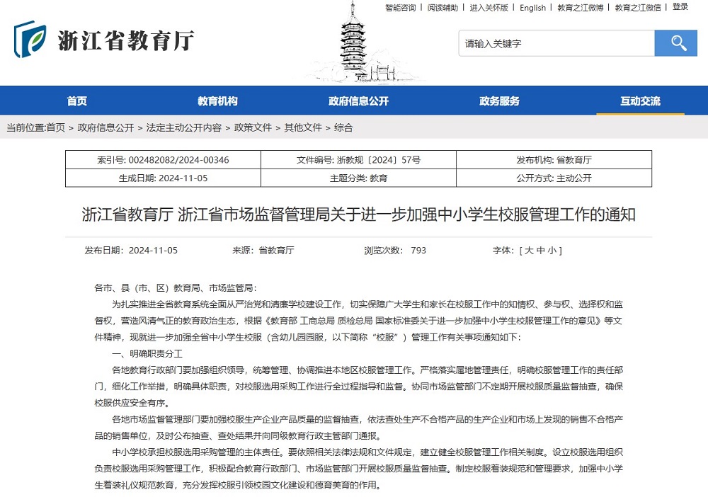 作為服裝產(chǎn)業(yè)發(fā)達(dá)省份,浙江省一直注重校服質(zhì)量。如2014年浙江省教育廳聯(lián)合浙江省質(zhì)量技術(shù)監(jiān)督局發(fā)布《關(guān)于進(jìn)一步加強(qiáng)學(xué)生服裝和床上用品管理工作的通知》;2018年,浙江省質(zhì)監(jiān)局聯(lián)合教育廳、工商局聯(lián)合發(fā)布了《浙江省學(xué)生服質(zhì)量提升行動(dòng)工作方案》;2022年10月,浙江省《教育收費(fèi)政策(2022年)》規(guī)定學(xué)校收取服務(wù)性收費(fèi)和代收費(fèi),堅(jiān)持學(xué)生自愿和非營(yíng)利原則,不得與學(xué)費(fèi)、住宿費(fèi)合并統(tǒng)一收取,不得從中牟利。