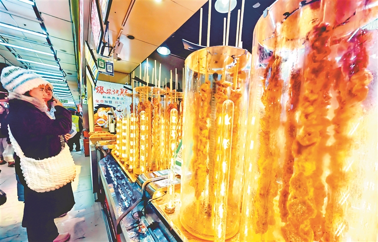 近日,哈爾濱道里菜市場內(nèi)非常熱鬧,許多南方游客到這里品嘗美食、打卡拍照。鍋包肉、紅腸、烤肉串等食品,格瓦斯、凍梨汁等飲品都受到青睞。