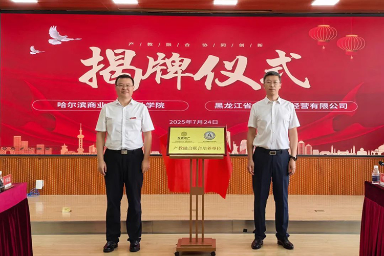 活動中,王彬、趙大偉共同為“產(chǎn)教融合聯(lián)合培養(yǎng)單位”揭牌。龍睿公司黨委委員、總會計師劉躍剛,哈爾濱商業(yè)大學會計學院院長梁運吉代表雙方簽署了《戰(zhàn)略合作協(xié)議》及《財務(wù)人員兩年培養(yǎng)工程計劃合作協(xié)議》。