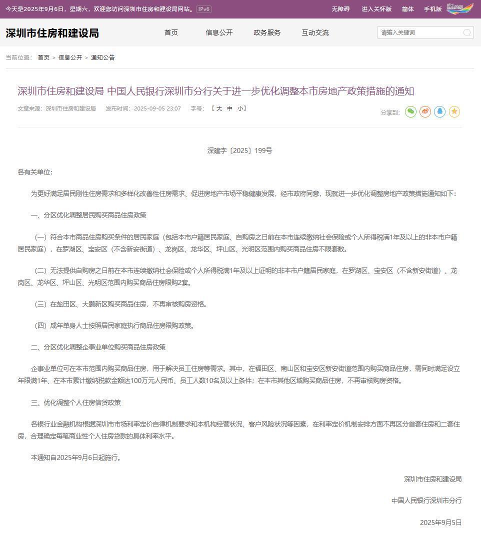 為進(jìn)一步滿足居民住房需求,促進(jìn)房地產(chǎn)市場平穩(wěn)健康發(fā)展,深圳市自2025年9月6日起優(yōu)化調(diào)整房地產(chǎn)政策,鹽田區(qū)、大鵬新區(qū)購買商品住房不再審核購房資格,其他部分區(qū)域也大幅放寬限購條件。