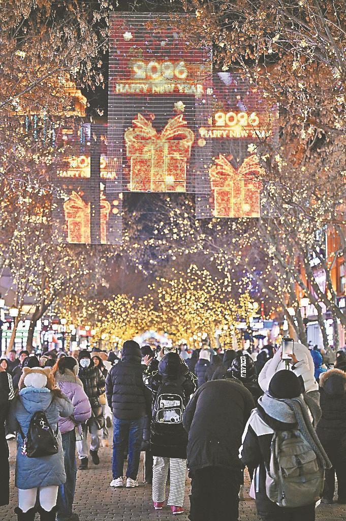 哈爾濱中央大街化身光影盛宴與煙火市集。以“瑞馬迎新”為主題的創(chuàng)意燈飾點亮了這條百年老街,動態(tài)飛馬踏星而行的造型靈動逼真,“馬上鴻運”樹燈牌流光溢彩,與街區(qū)內的歐式建筑輪廓交相輝映,勾勒出一幅夢幻的冬日夜景。面包石鋪就的街道上人潮涌動,來自五湖四海的人們肩并肩、手牽手,共赴這場跨年之約。