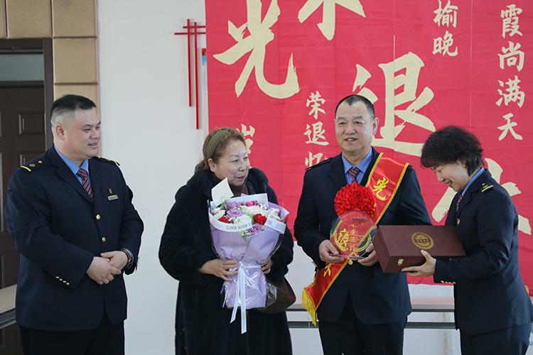 客運段團委書記張蔚萌代表段黨委,為馮春生同志送上誠摯的祝福,并鄭重地遞上鐫刻著“光榮退休”字樣的紀念牌。緊接著,班組精心準備的一份“驚喜”將現(xiàn)場氣氛推向高潮——馮春生同志的愛人捧著鮮花,在大家的掌聲中走上臺來。夫妻二人相視而笑,這份來自家庭的溫暖與支持,讓馮春生同志感動不已。