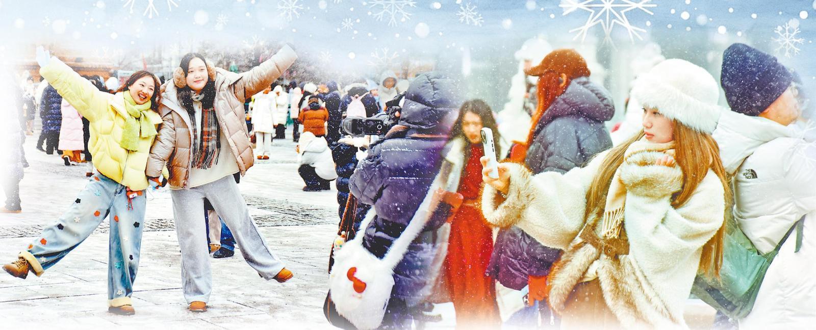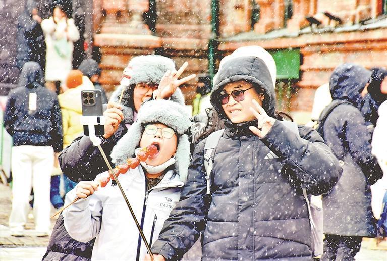 17日,正月初一。哈爾濱市迎來(lái)了降雪天氣。樹(shù)上、車上、建筑上、道路上都落了一層白雪,為節(jié)日里的冰城增添了更多魅力。在各處景點(diǎn),市民和游客在雪中拍照、玩耍,盡享降雪帶來(lái)的快樂(lè)。